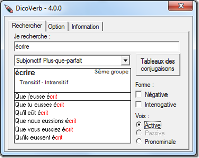 Bien oui, il y a tout ça. Mais, moi je vous offre ce petit outil tout simple.: Le DicoVerbe. Rapide et efficace. Il contient des milliers de verbes dans toutes les conjugaisons possibles. Aucun accès Internet. Aucune installation. C’est un unique fichier exécutable. Il tient sur votre clef USB. Un icône sur votre bureau. Il peut se placer dans la barre des tâches. Maintenant , conjuguez en 2 clics , trois mouvements. Un indispensable !